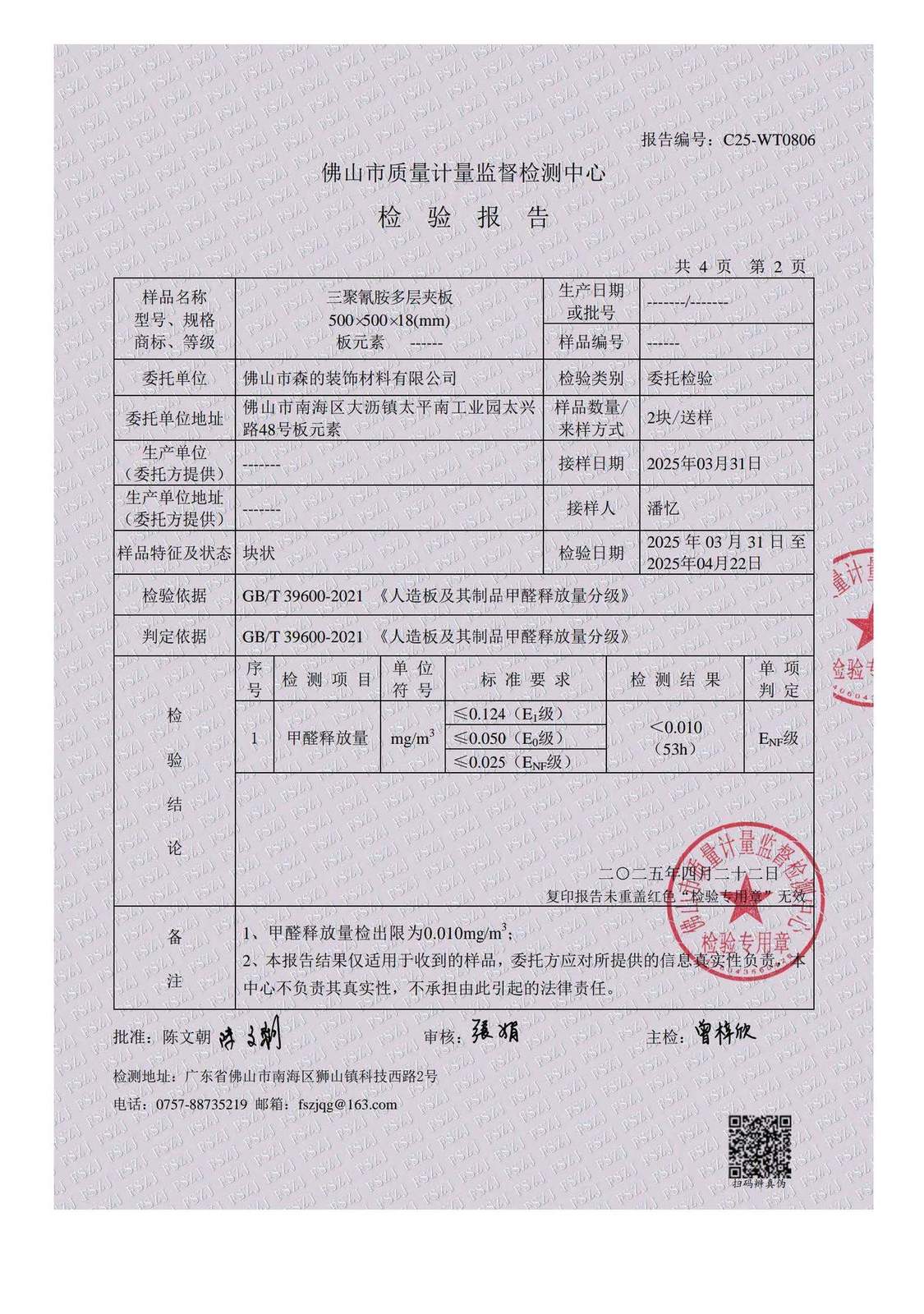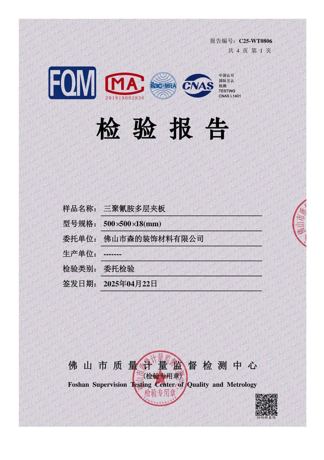 The following is not a marketing claim – it is the official third-party laboratory report from the Foshan Supervision Testing Center of Quality and Metrology (CNAS L1401 accredited, CMA certified). This government-accredited lab independently tested Caramella's premium melamine-faced multi-layer plywood for formaldehyde emissions under GB/T 39600-2021.